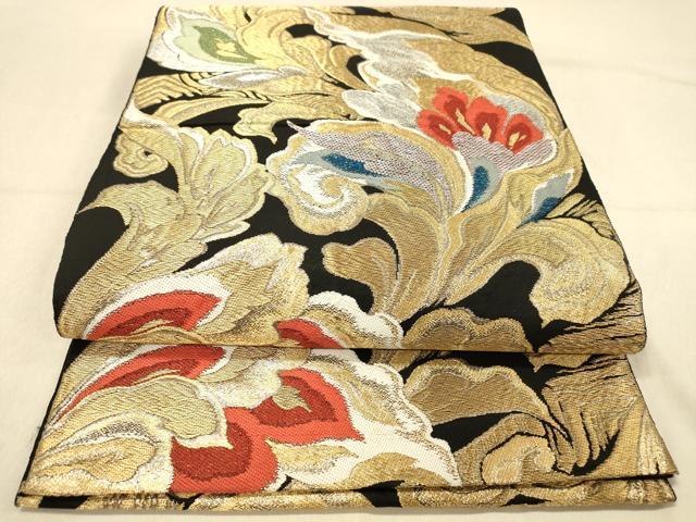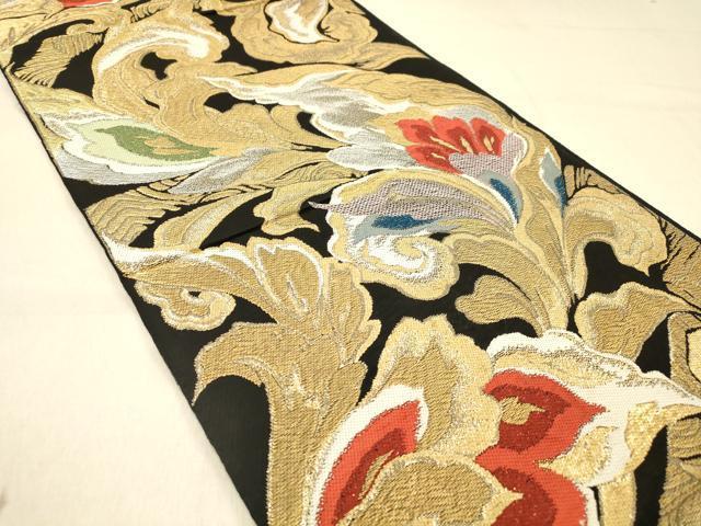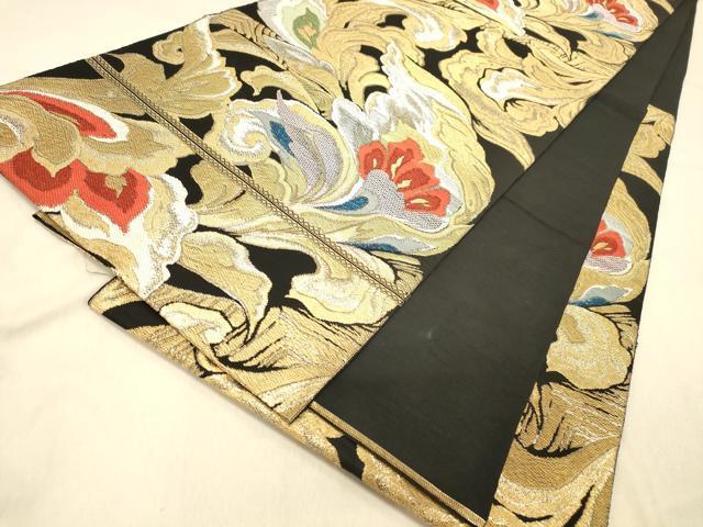 Heiwaya Kimono ◎ Six-pass pattern genuine bag obi, chintz floral design, black background, gold and silver thread, pure silk, exquisite item DAAZ3901jm