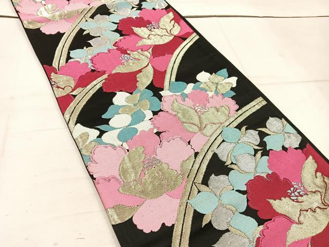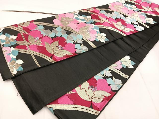 Heiwaya Kimono ◎ Six-pass pattern obi, Karaori weave, peony design, black background, gold and silver thread, pure silk, exquisite item, BAAW1331mz