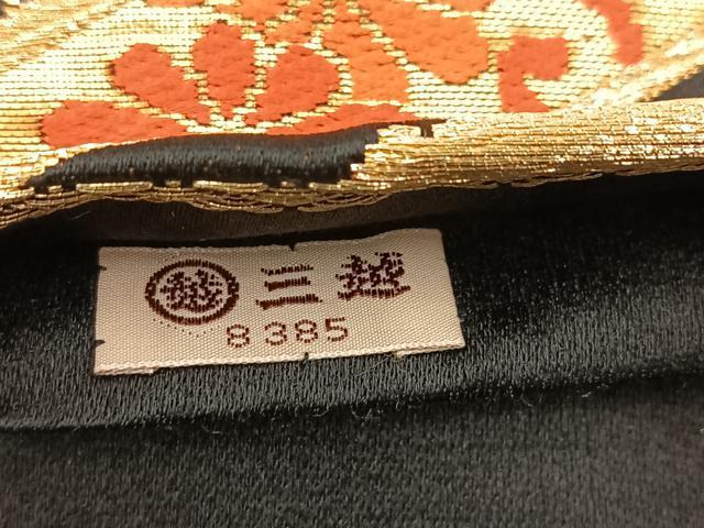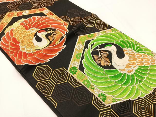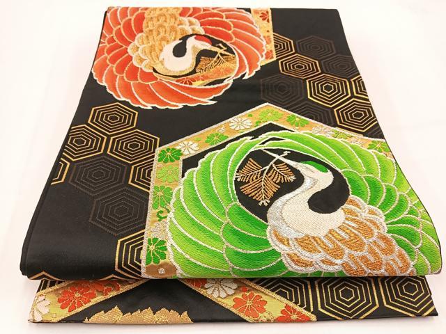 Heiwaya Kimono ◎ Six-Piece Pattern Obi (Sash), Karaori Weave, Flying Crane and Tortoise Shell Design, Black Background with Gold Thread, Item #BAAV7478yc, Available at Mitsukoshi, Pure Silk