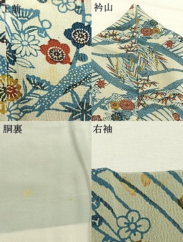 状態は接写画像のように上前・衿山・胴裏・右袖に薄い汚れがございますが