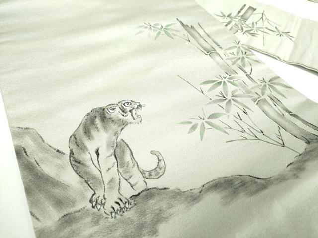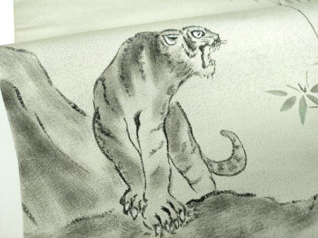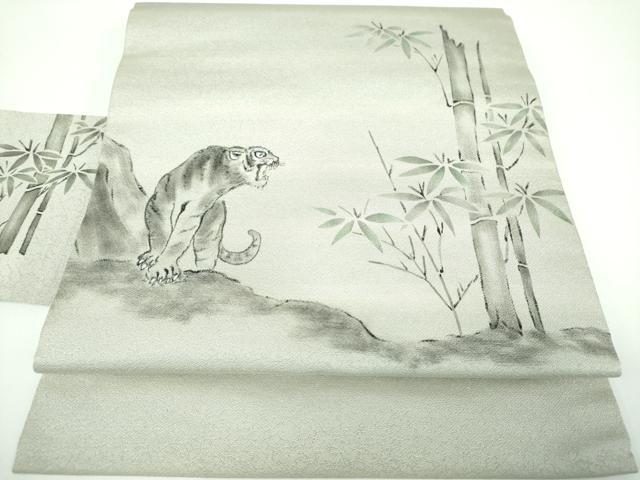 Heiwaya Kimono: 9-inch Nagoya Obi (Sash), Hand-Painted Tiger and Bamboo Design, Pure Silk, Excellent Item, DABB4301ps