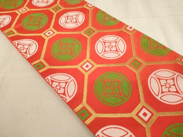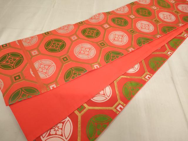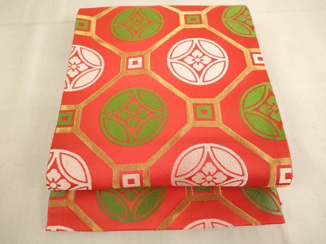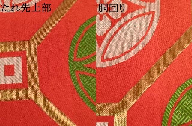袋帯【化繊】の状態は接写画像のように、垂れ先上部・胴回りに汚れがございますが