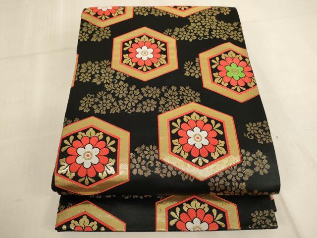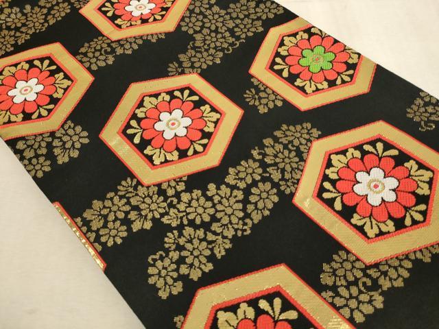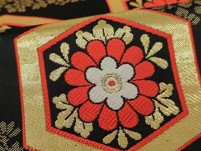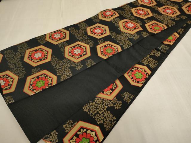 Heiwaya Kimono Children's Full-Length Obi with Tortoiseshell and Floral Design, Black with Gold Thread, AAAU5397ja