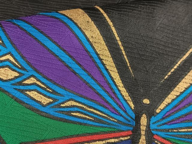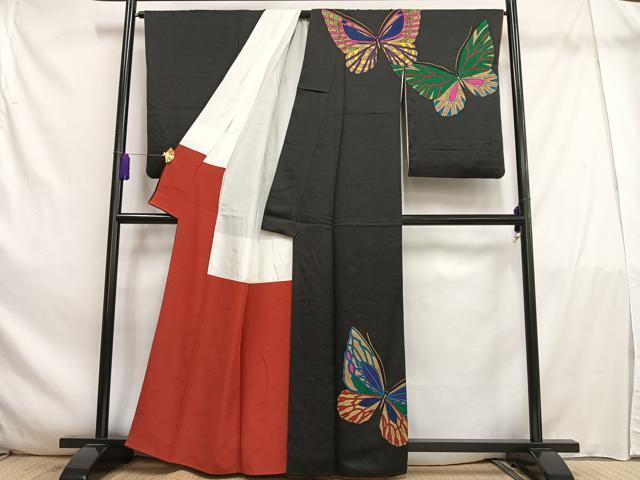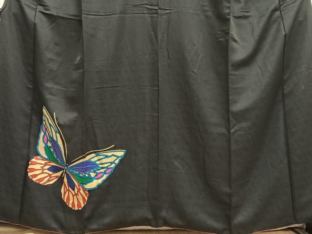 Heiwaya Kimono: Dyeing artist Saito Sansai's visiting kimono with dancing butterfly pattern, black background with gold accents, pure silk, exquisite item, AABE5020oa