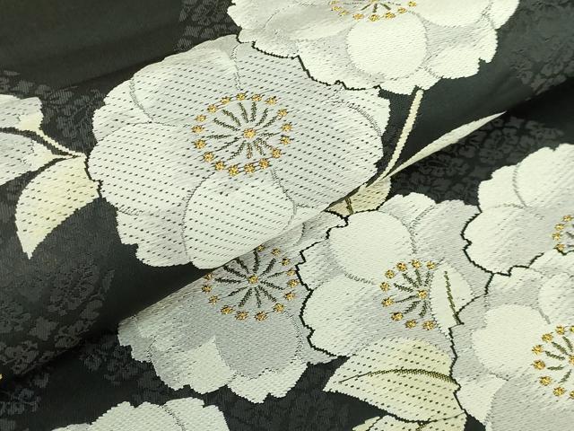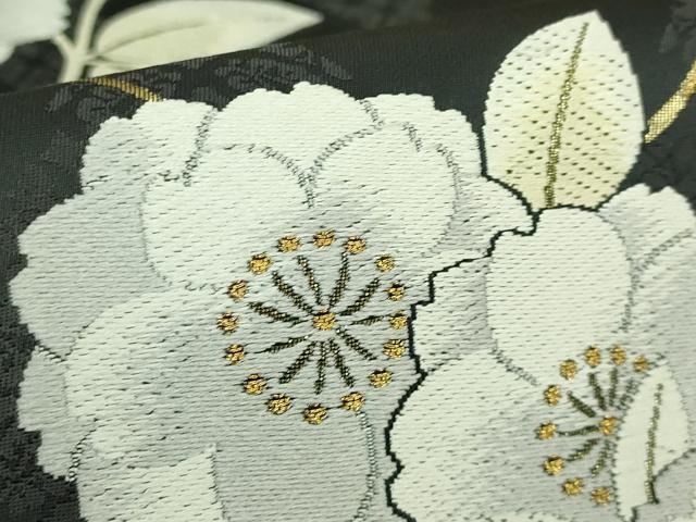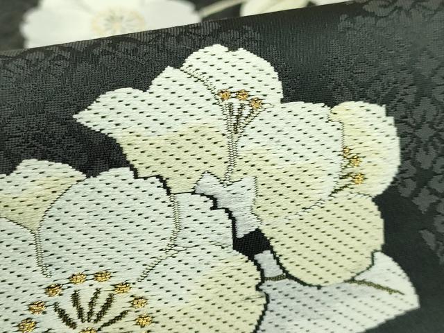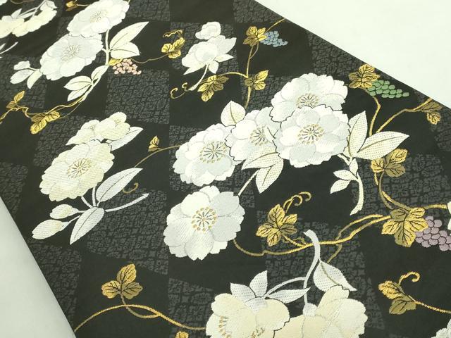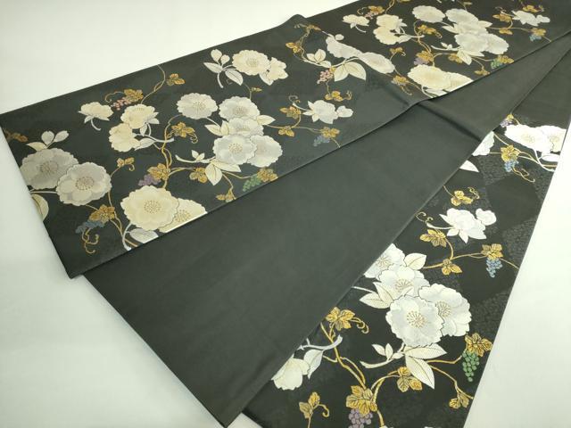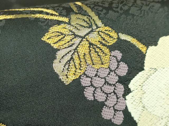 Heiwaya Kimono: Exquisite Six-Piece Fukuro Obi (Sash), Karaori Weave, Grape and Ivy Leaf and Flower Design, Black Background with Gold Thread, Excellent Condition, DZAB2383kh6