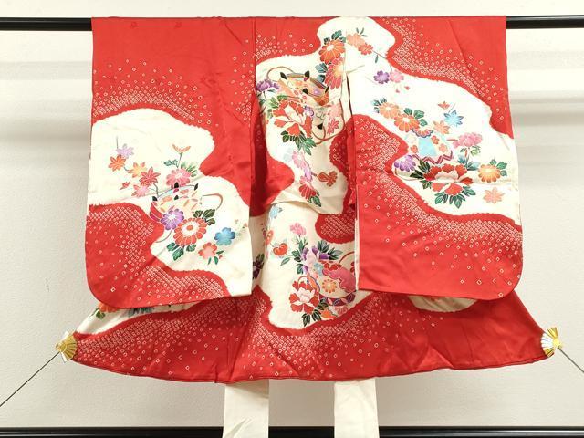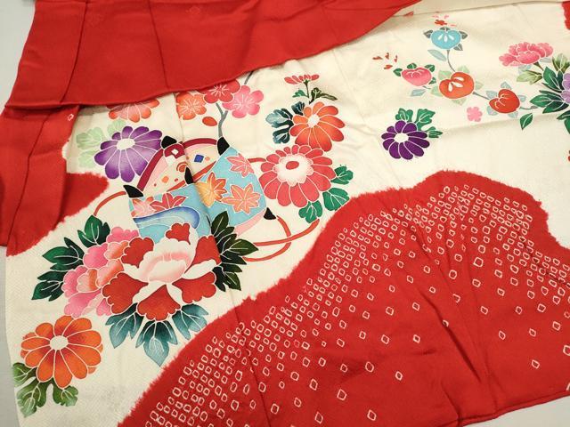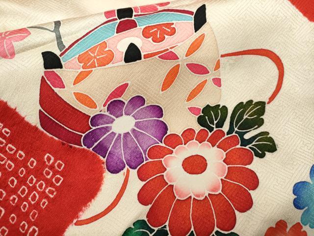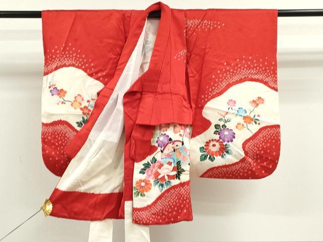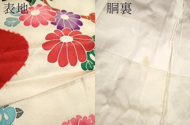 産着【表地:正絹・胴裏:化繊】の状態は接写画像のように表地所々・胴裏に薄い汚れがございます。