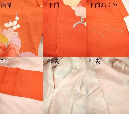 着物【表地:正絹・胴裏:化繊】の状態は接写画像のように両袖・紐・下前・下前おくみ・胴裏に薄い汚れ、胴裏に破れがございます。