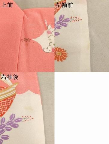 着物【化繊】の状態は接写画像のように上前・左袖前・右袖後に薄い汚れがございますが