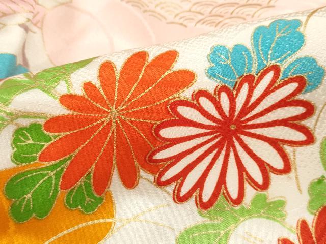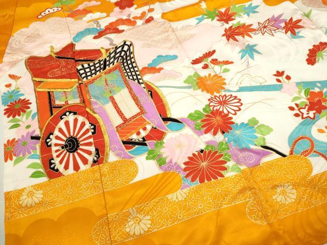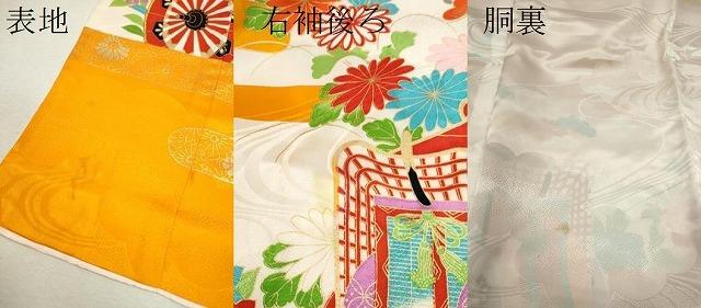 着物【化繊】の状態は接写画像のように表地所々・胴裏に薄い汚れ、右袖後ろに箔の剥がれがございます。