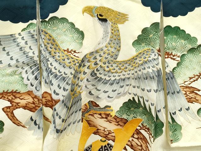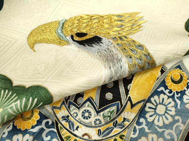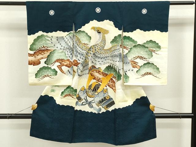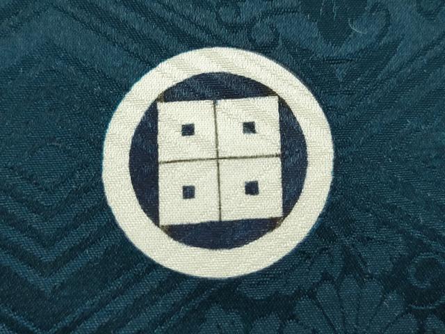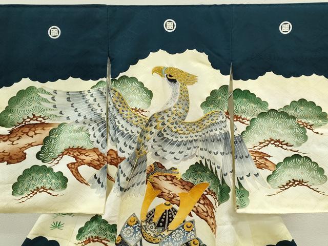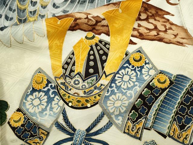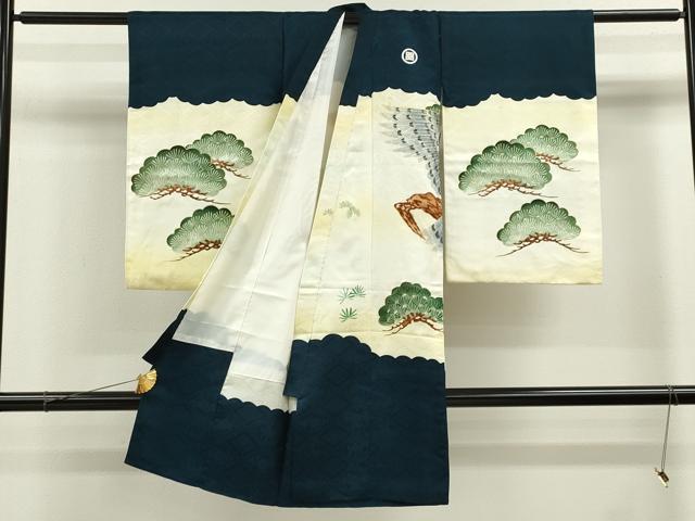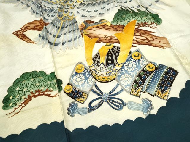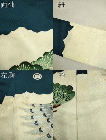 産着【表地:正絹・胴裏:化繊・五つ紋】の状態は接写画像のように両袖前・紐・左胸・衿に薄い汚れがございますが