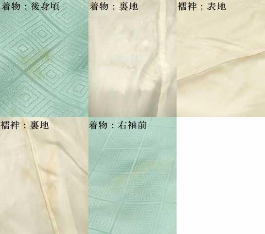 接写画像のように着物:後身頃・裏地・右袖前に薄い汚れ、