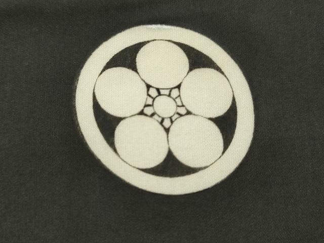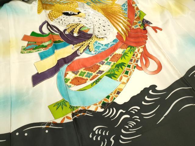産着【祝着:正絹、襦袢:化繊・五つ紋】の状態は接写画像のように祝着と襦袢の表地所々・胴裏に薄い汚れ、祝着の右袖付けに糸解け、下前に補修跡がございます。