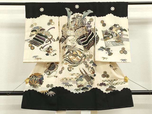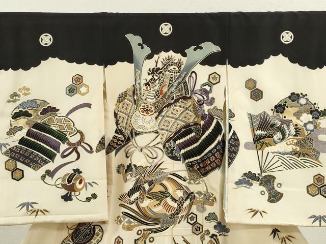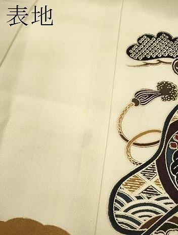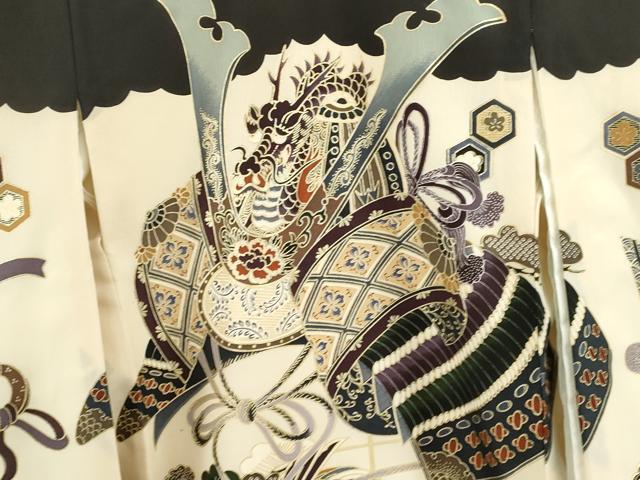 産着【表地:正絹・胴裏:化繊、襦袢:化繊・五つ紋】の状態は接写画像のように表地所々に薄い汚れがございます。