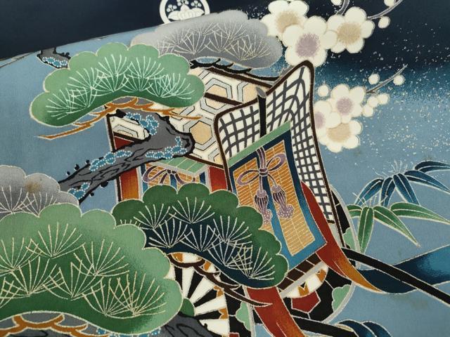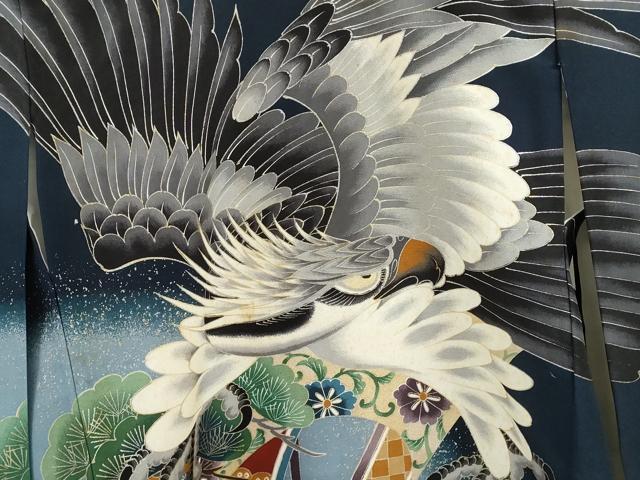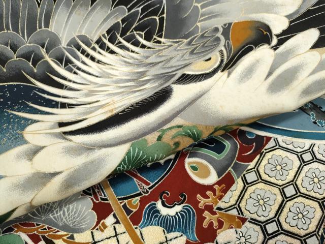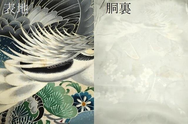 産着【表地:正絹・胴裏:化繊・五つ紋】の状態は接写画像のように表地所々・胴裏所々に薄い汚れがございます。