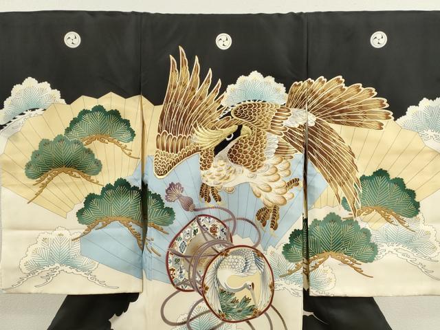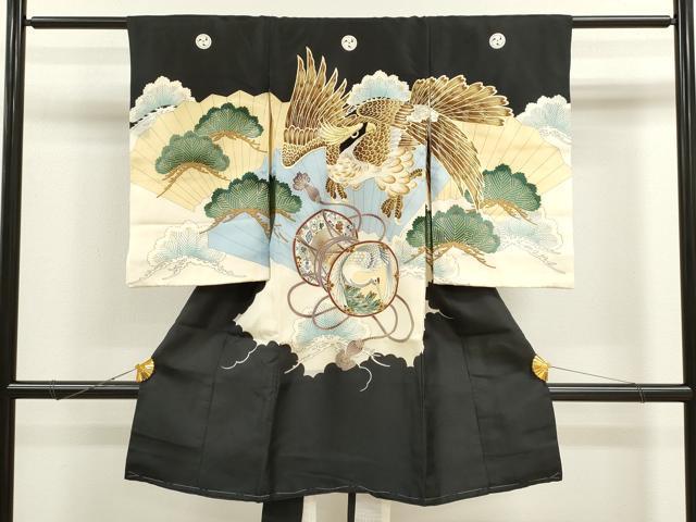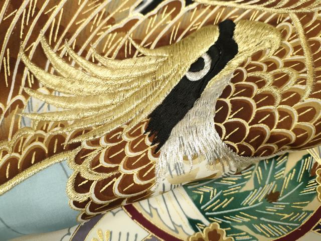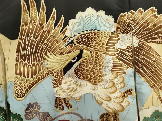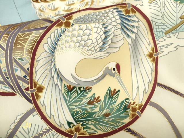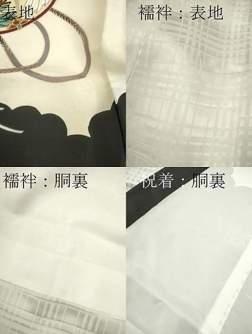 産着【表地:正絹・胴裏:化繊、襦袢:化繊・五つ紋】の状態は接写画像のように祝着と襦袢の表地所々・胴裏・紐に薄いシミがございます。