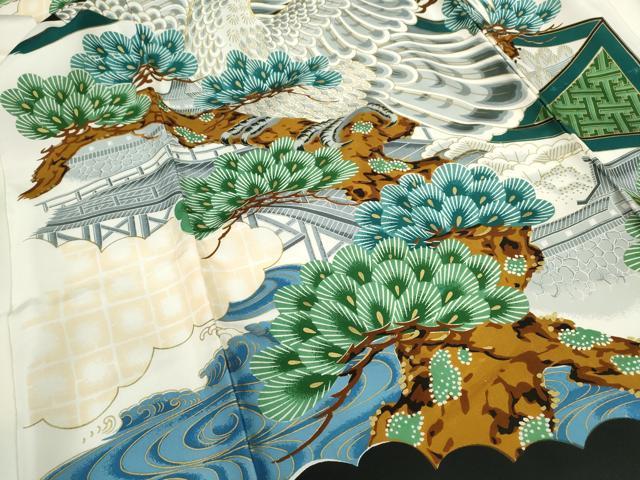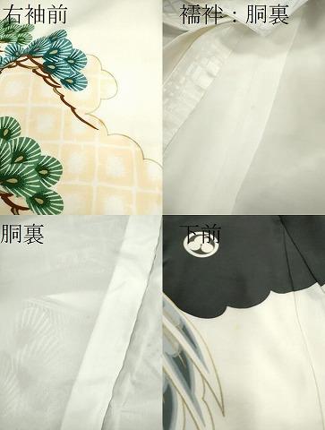 産着【表地:正絹・胴裏:化繊、襦袢:化繊・五つ紋】の状態は接写画像のように右袖前・胴裏・下前・襦袢の胴裏に薄い汚れがございますが