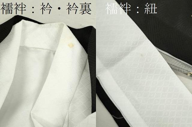 産着【表地:正絹・胴裏:化繊、襦袢:化繊・五つ紋】の状態は接写画像のように襦袢の衿・衿裏・襦袢の紐に薄い汚れがございますが