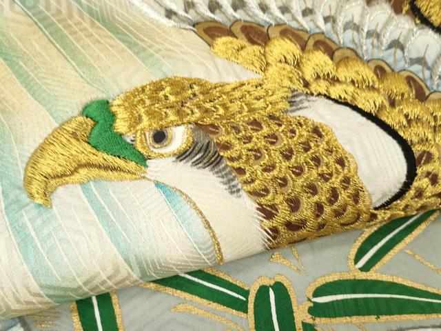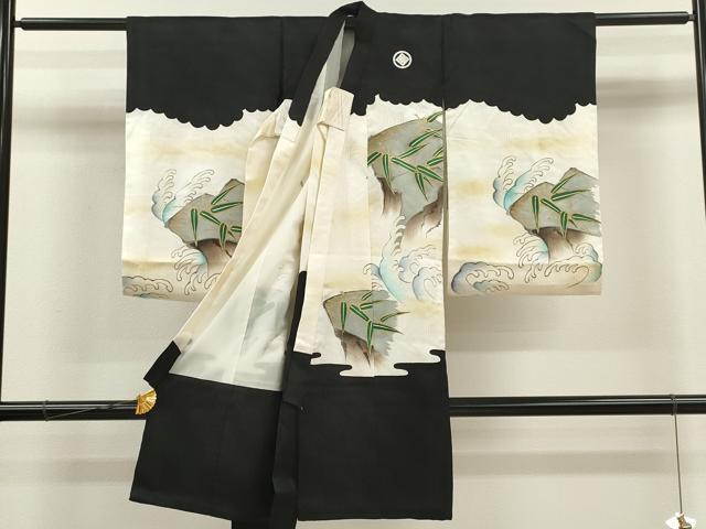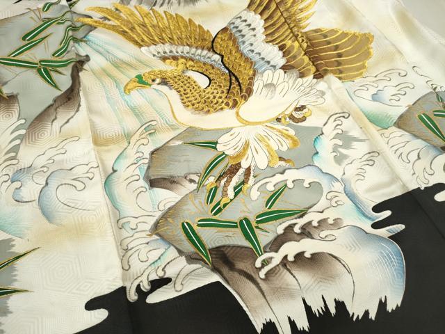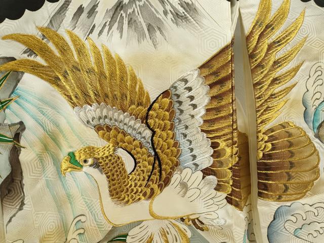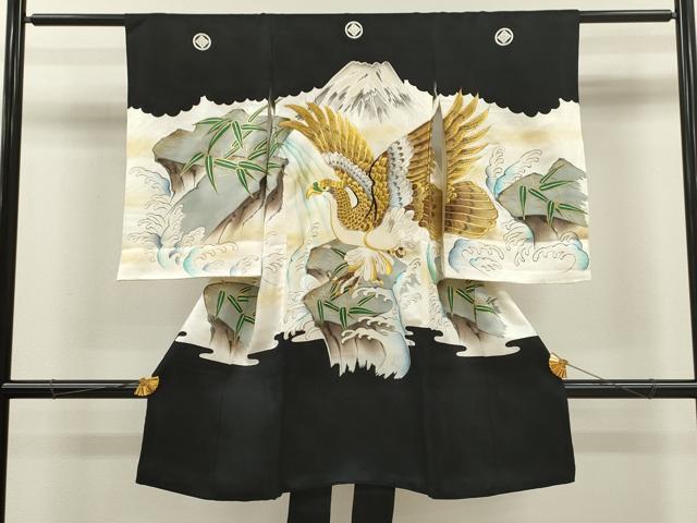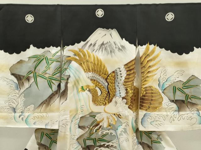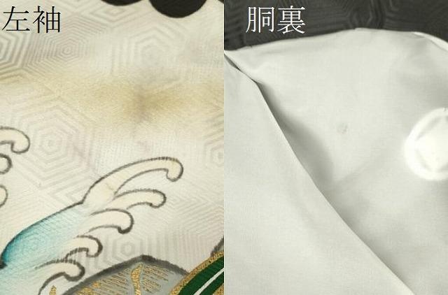 産着【表地:正絹・胴裏:化繊・五つ紋】の状態は接写画像のように左袖・胴裏に薄い汚れがございますが