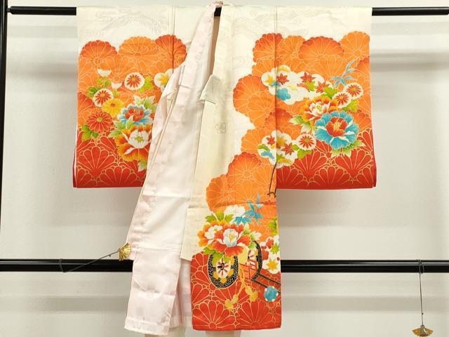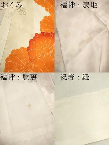 産着【表地:正絹・胴裏:化繊、襦袢:化繊】の状態は接写画像のようにおくみ・紐・襦袢の表地所々・胴裏に薄い汚れがございます。