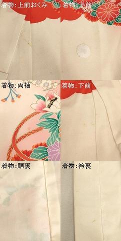 産着【正絹】の状態は接写画像のように上前おくみ・上前・両袖・下前・胴裏・衿裏に汚れ、上前に補修跡がございますが