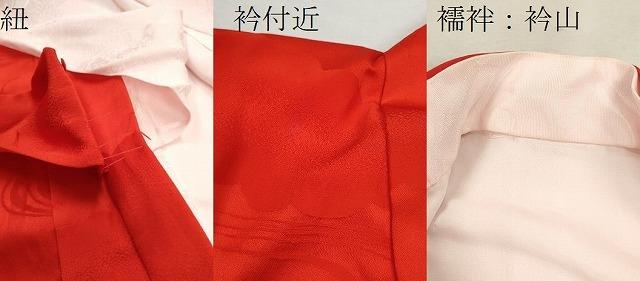 産着【表地:正絹・胴裏:化繊、襦袢:化繊】の状態は接写画像のように衿付近・襦袢の衿山に薄い汚れ、祝着の紐に糸解けがございますが