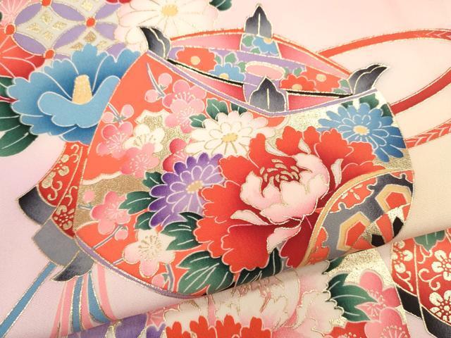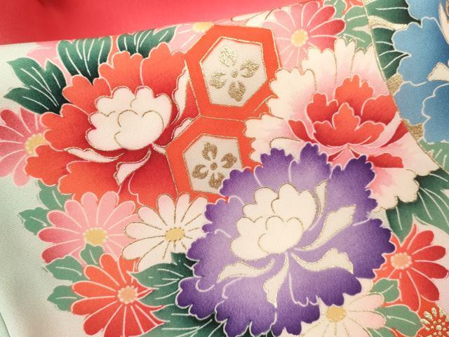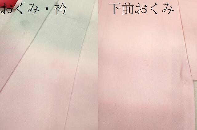 産着【表地:正絹・胴裏:化繊、襦袢:化繊】の状態は接写画像のようにおくみ・衿・下前おくみに薄い汚れがございますが