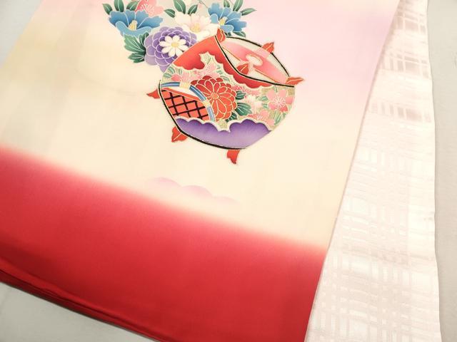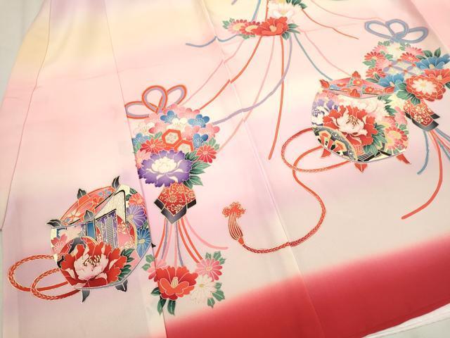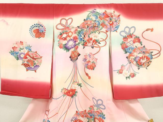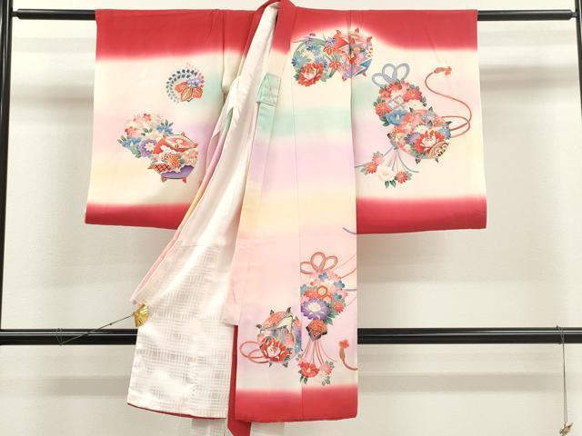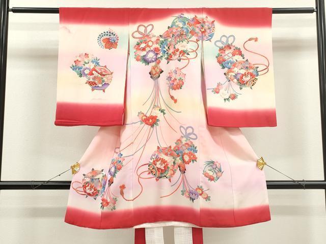 Heiwaya Kimono for Shrine Visits, Girls, Celebration Kimono, Baby Kimono, First Kimono, Noshime Kimono, Spinning Wheel and Bouquet Design, Gradation Dye, Gold Accents, Excellent Quality, CAAT6056ze