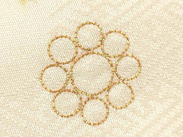 産着【表地:正絹・胴裏:化繊・一つ紋】の状態は接写画像のように表地所々・胴裏に薄い汚れがございます。