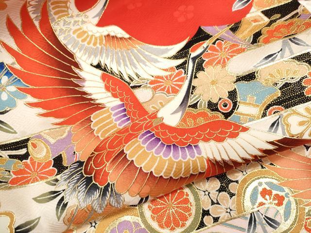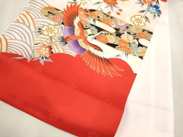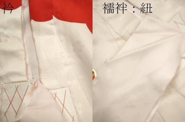 産着【表地:正絹・胴裏:化繊、襦袢:化繊】の状態は接写画像のように衿・襦袢の紐に薄い汚れがございますが