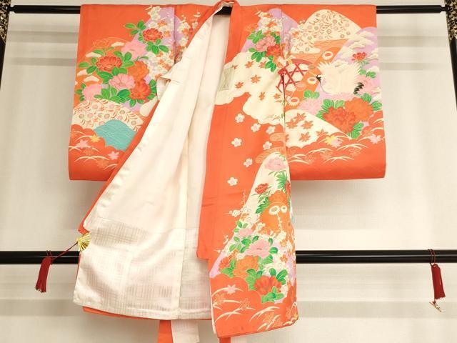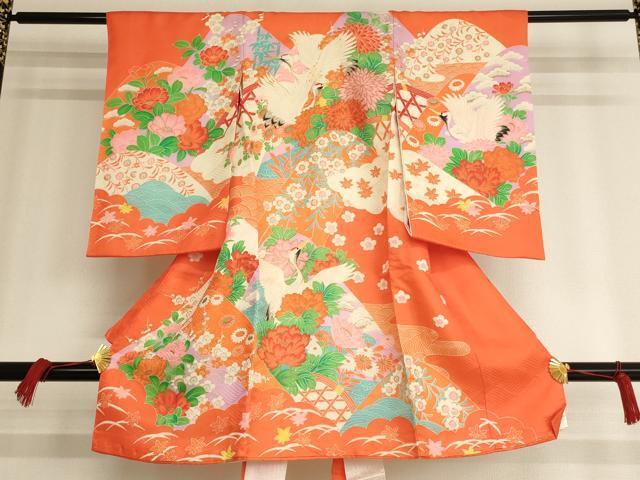 Heiwaya Kimono for Shrine Visits, Girls, Celebration Kimono, Baby Kimono, First Kimono, Noshimen, Koma Embroidery, Flying Crane and Flower Design, Gold Accents, Excellent Quality, AAAW6891ja