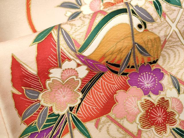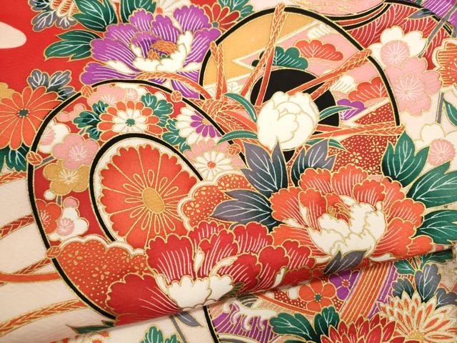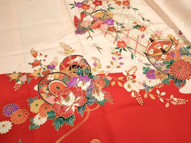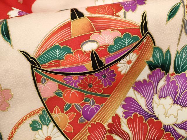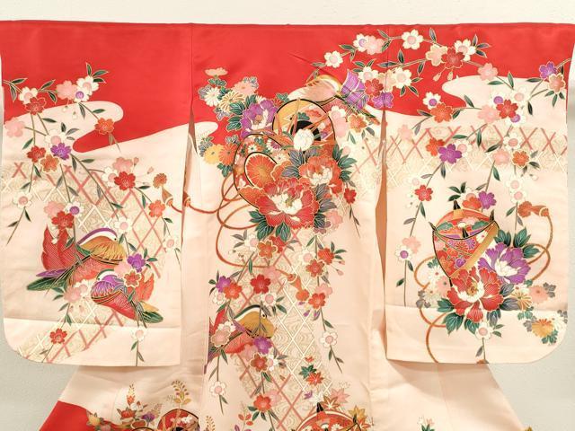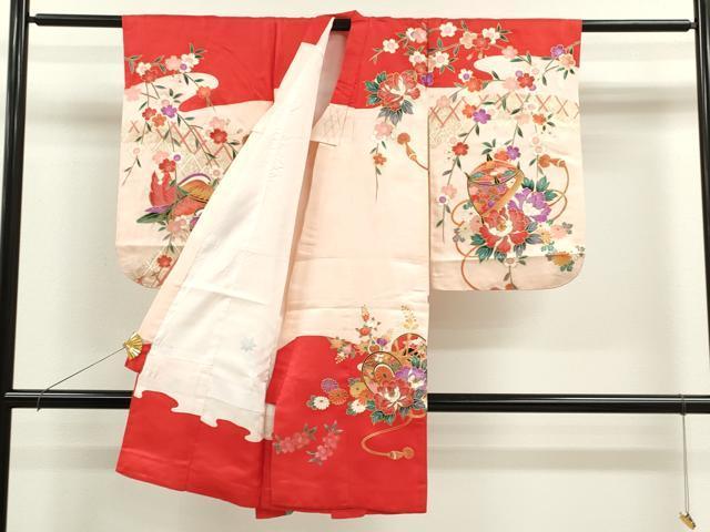 Heiwaya Kimono for Shrine Visits, Girls, Celebration Kimono, Baby Kimono, First Kimono, Noshimen Kimono, Drum, Spinning Wheel, Mandarin Duck, and Flower Design, Gold Accents, Excellent Item, CAAV9254ze