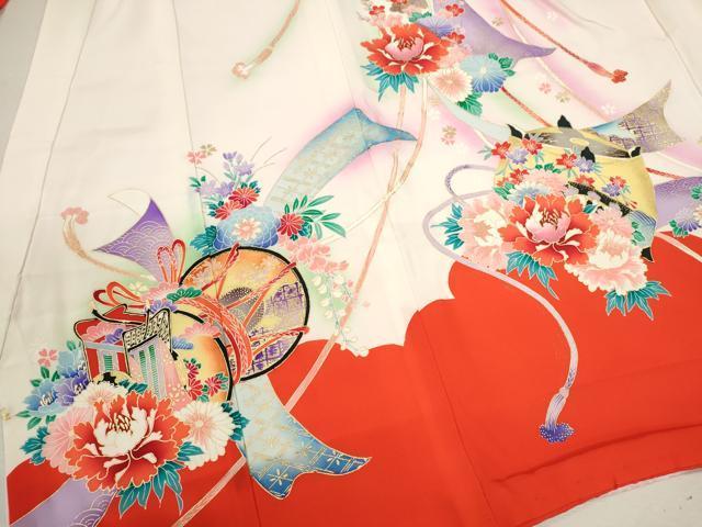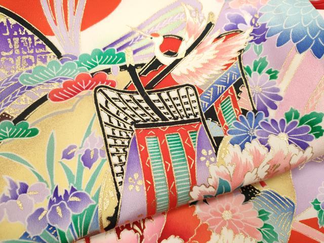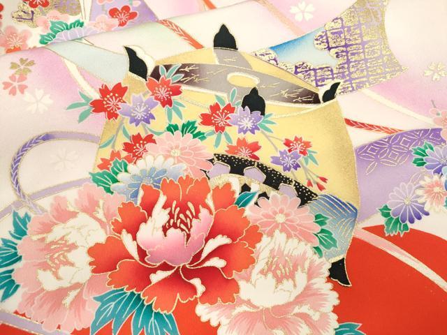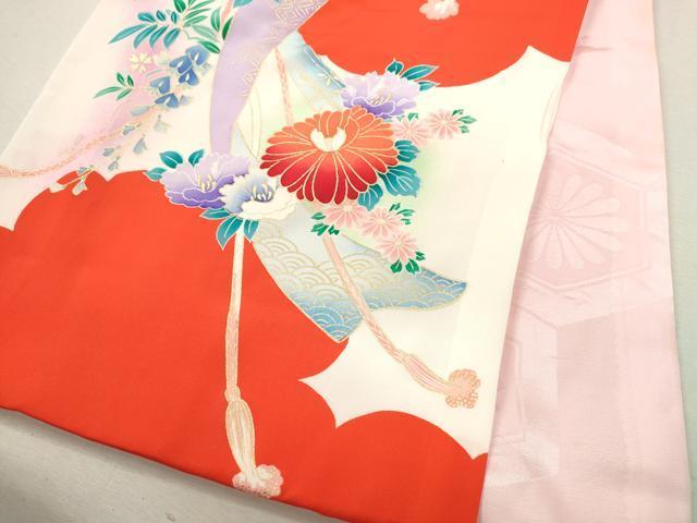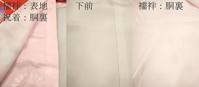 産着【表地:正絹・胴裏:化繊、襦袢:化繊】の状態は接写画像のように祝着と襦袢の胴裏、襦袢の表地所々、祝着の下前に薄い汚れがございます。