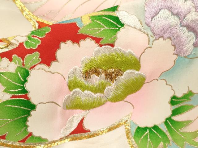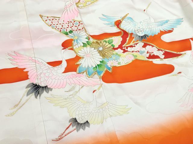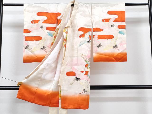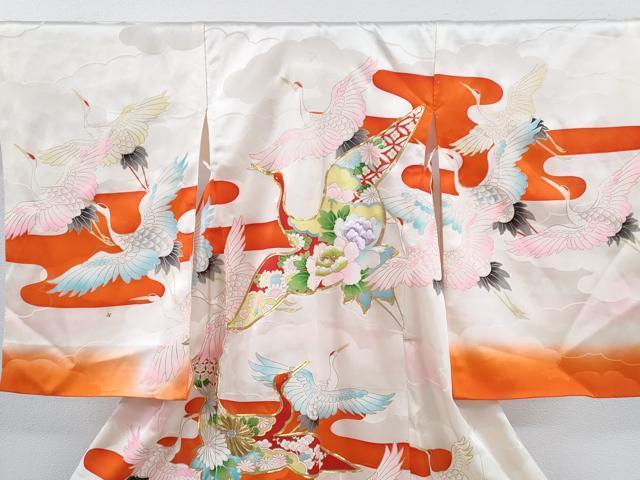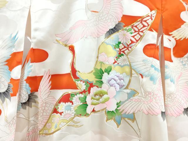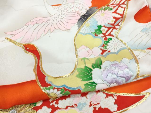 Heiwaya Kimono for Shrine Visits, Girls, Celebration Kimono, Baby Kimono, First Kimono, Noshimen, Koma Embroidery, Flying Crane and Floral Design, Gold Accents, Excellent Quality, CAAT6018ze