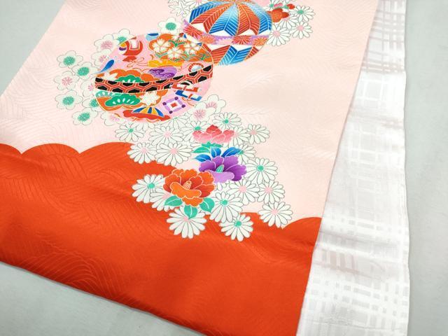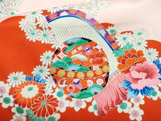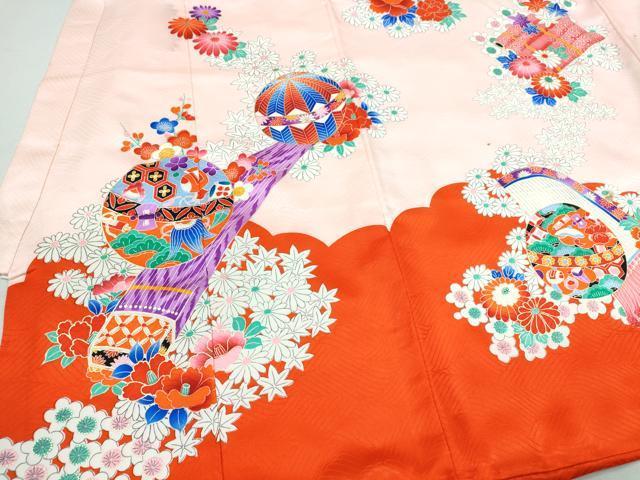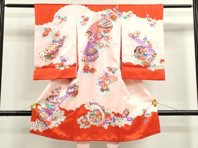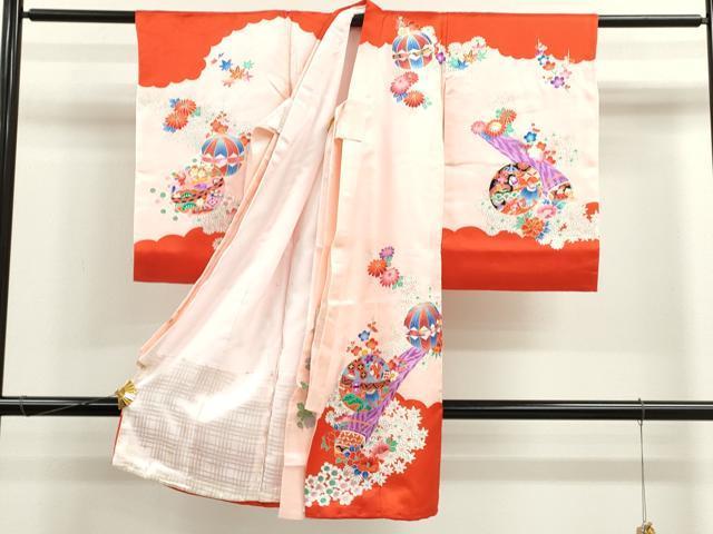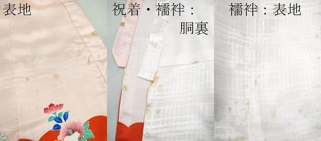 産着【表地:正絹・胴裏:化繊、襦袢:化繊】の状態は接写画像のように祝着と襦袢の表地所々・胴裏所々に薄い汚れがございます。