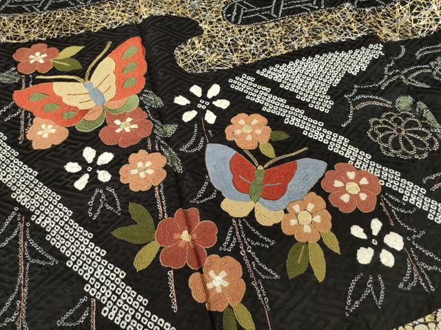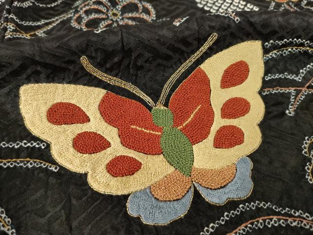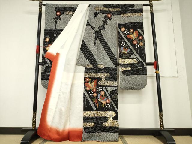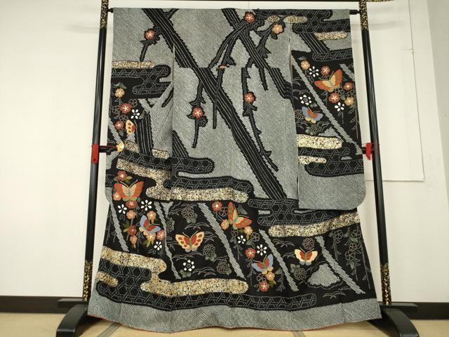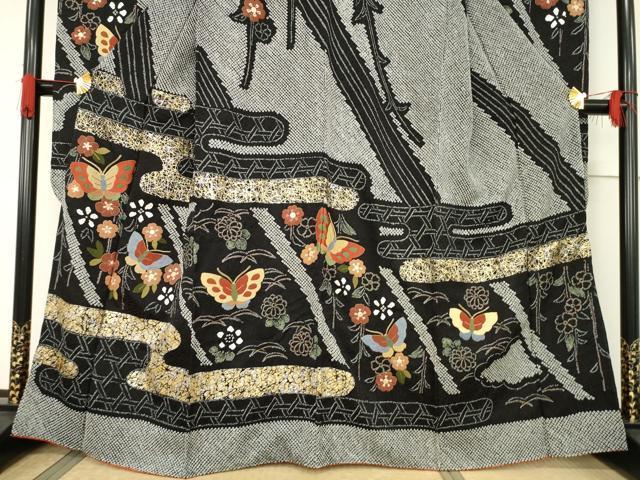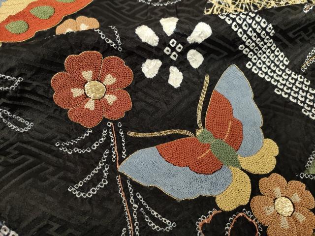 Heiwaya Kimono: Gorgeous furisode kimono, all-over tie-dye, featuring the three major Chinese embroidery techniques, Sagara embroidery, floral and butterfly design, black background, gold and silver accents, pure silk, exquisite item, AABF1353ck