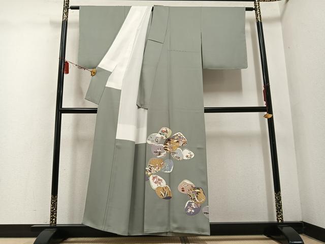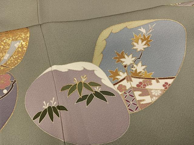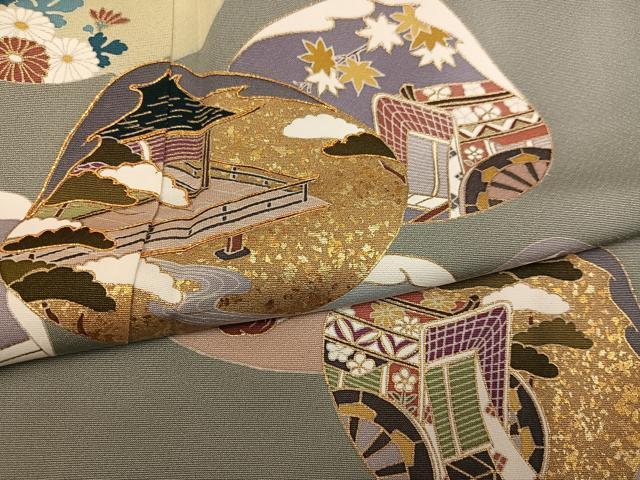 Heiwaya Kimono: Gorgeous Iro-tomesode (colored formal kimono) with Koma embroidery, featuring a shell-matched landscape and floral motif, gold accents, and a genuine silk design. AABE3991ph