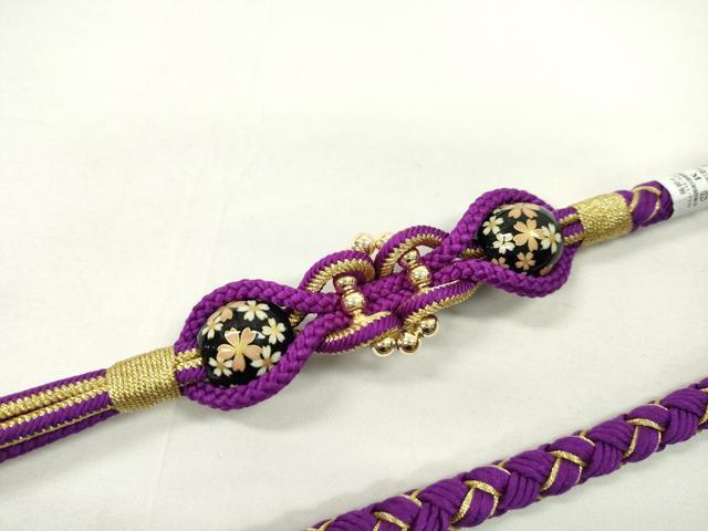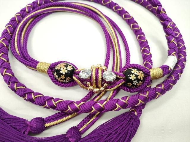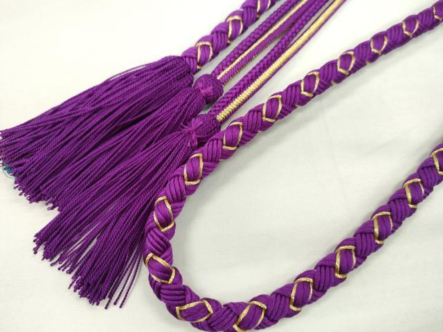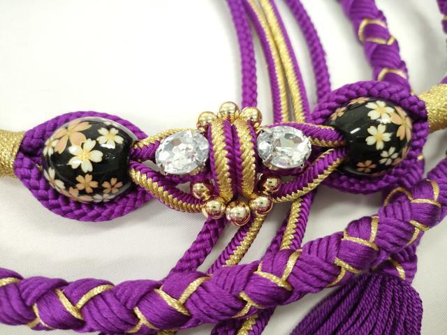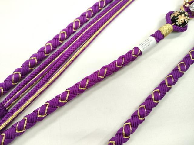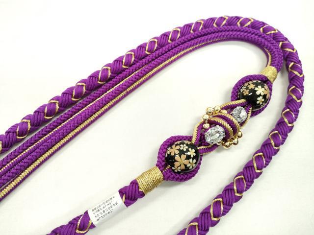 Heiwaya Kimono: Japanese Accessories, Furisode Obi-jime (Sash Band), Decorated with Beads, Bijoux, Purple, Gold Thread, and Twisted Tassels. Excellent Condition, Unused. CAAX8317ju