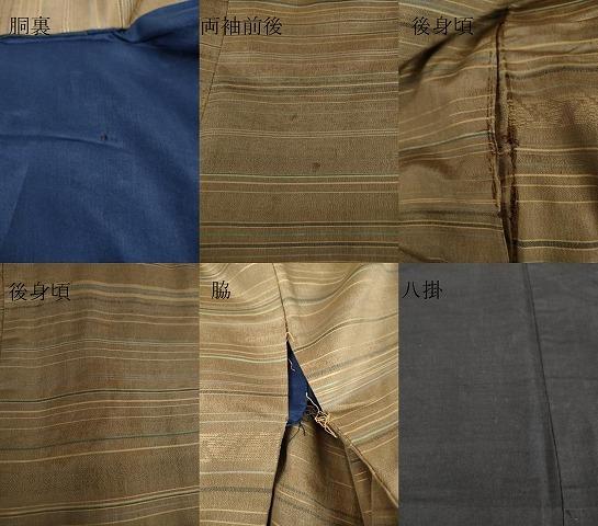 状態は接写画像のように胴裏に穴、両袖前後に薄い汚れ、後身頃にシミ・糸解け、脇に糸解け、八掛に薄いシミがございます。