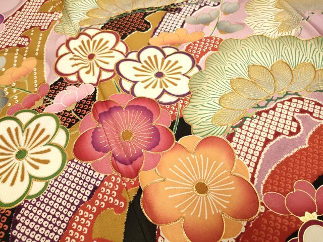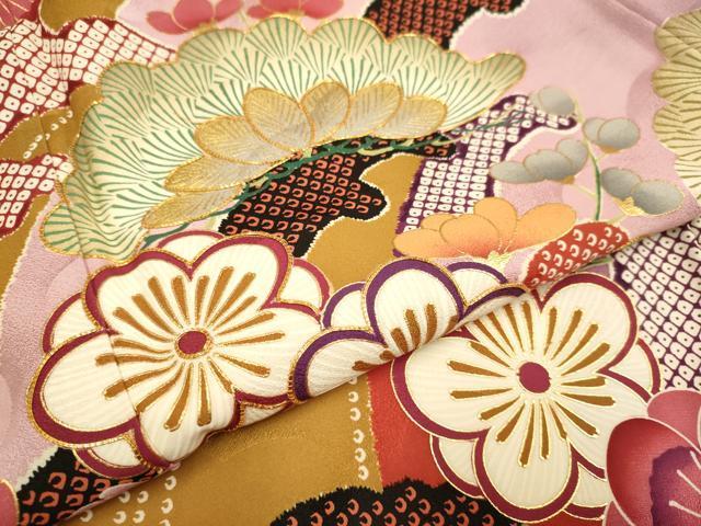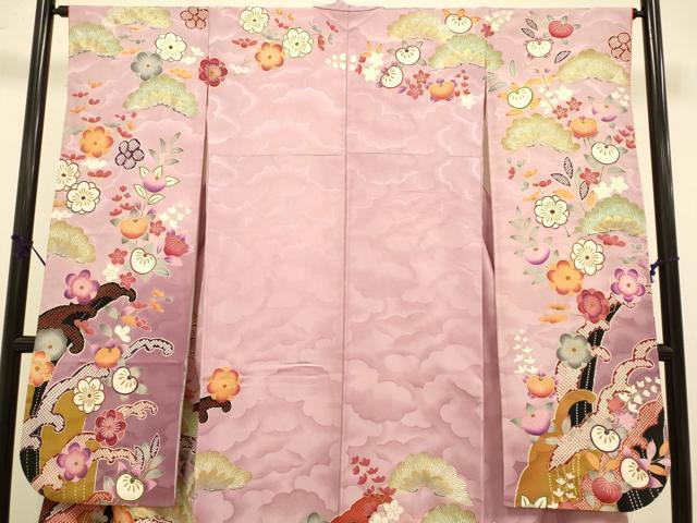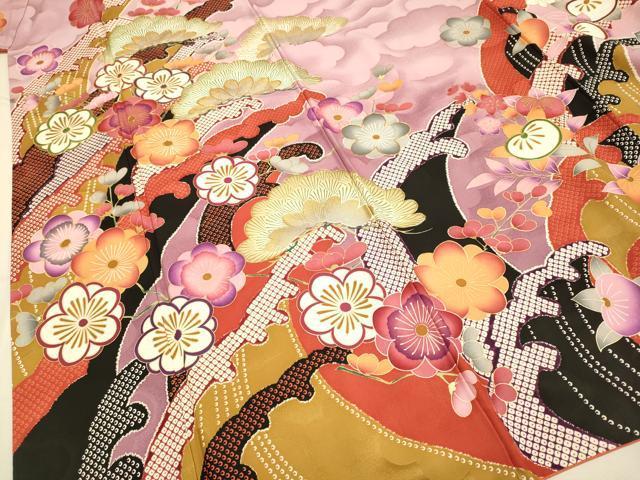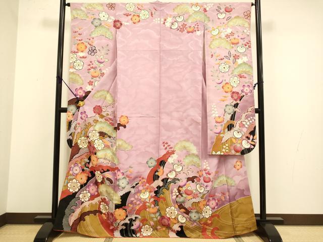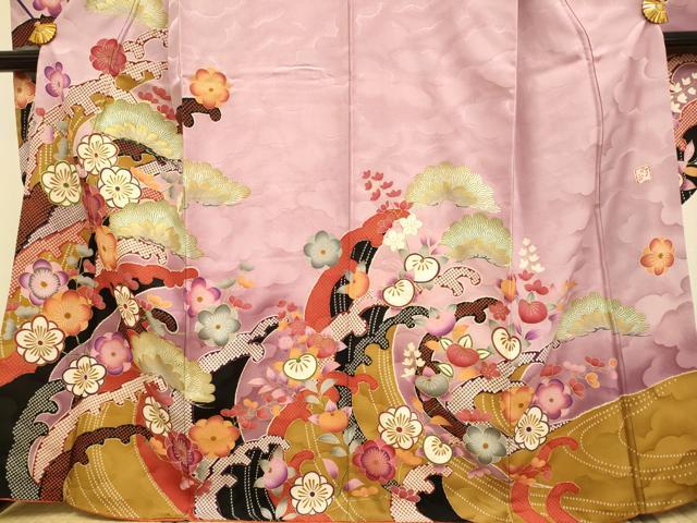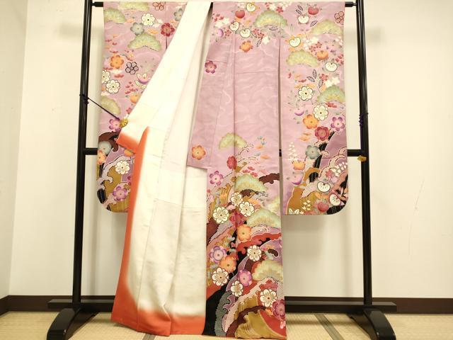 Heiwaya Kimono: Purple Ribbon Medal by Master Iwata Sentaro. Furisode Kimono with Koma Embroidery, Standing Waves, Plum and Pine Design, Gradient Dye, Gold Accents, Pure Silk, Excellent Item, DABA8887du