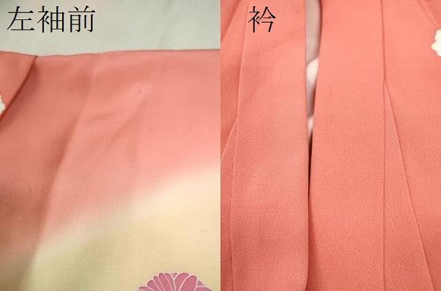 着物【表地:正絹・胴裏:化繊】の状態は接写画像のように左袖前・衿に薄い汚れがございますが