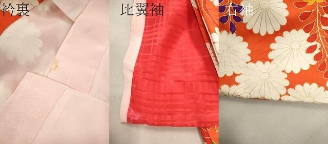着物【表地:正絹・胴裏:化繊】の状態は接写画像のように比翼袖・右袖に薄い汚れがございますが