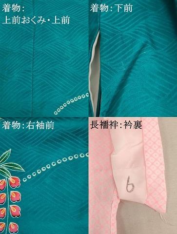 着物【正絹】の状態は接写画像のように上前おくみ・上前・下前・右袖前に薄い汚れがございますが