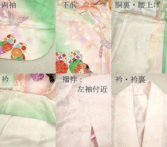 着物【表地:正絹・胴裏:アセテート】の状態は接写画像のように両袖・衿・下前・胴裏に薄い汚れ、胴裏の腰上げ部分に糸解けがございますが