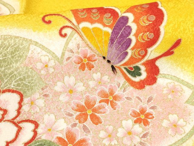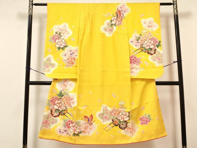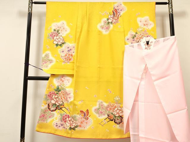 Heiwaya Kimono Set for Shichi-Go-San Ceremony, Age 7, Girl, Four-Piece Kimono Set with Undershirt (Single Layer Kimono and Half-Collar Embroidery), Dancing Butterfly and Flower Carriage Design, Gradient Dye, Gold Accents, Excellent Item, DAAY3130ma