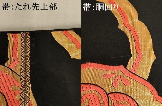 袋帯【化繊・芯なし】の状態は接写画像のように垂れ先上部・胴回りに薄い汚れがございますが