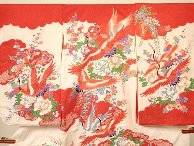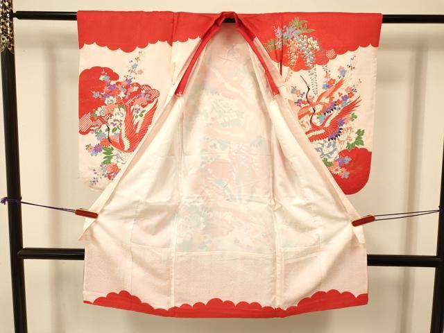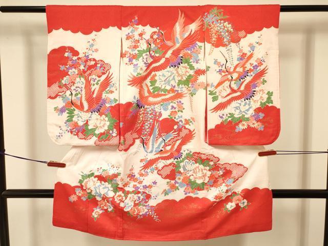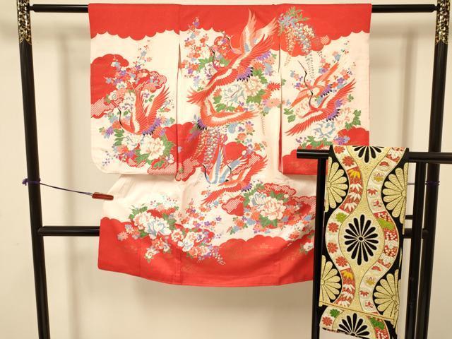 Heiwaya Kimono Shichi-Go-San (7-5-3) Set for Girls (3-Year-Old) - Celebration Kimono with Three-Piece Set and Fukuro Obi (Sash) - Flying Crane and Flower Design, Gold Accents, Excellent Item, DAAR6455ma