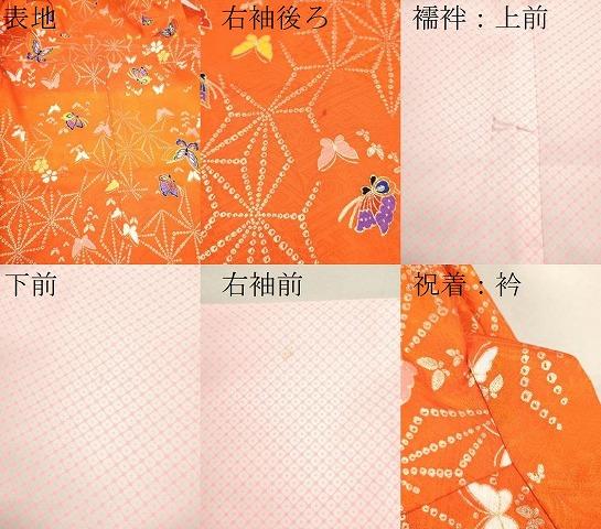 着物【化繊】の状態は接写画像のように表地にヤケ、右袖後ろ・衿・紐・重ね衿に薄い汚れがございます。