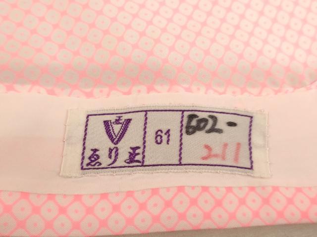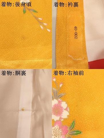 着物【化繊】の状態は接写画像のように後身頃・胴裏に汚れ、右袖前に薄い汚れ、衿裏にシールがございますが
