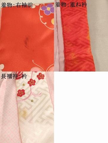 着物【化繊・重ね衿:取り外し可能】の状態は接写画像のように右袖前・重ね衿に汚れがございますが