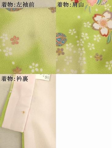 着物【化繊】の状態は接写画像のように左袖前・肩山に薄い汚れ、衿裏に汚れがございますが